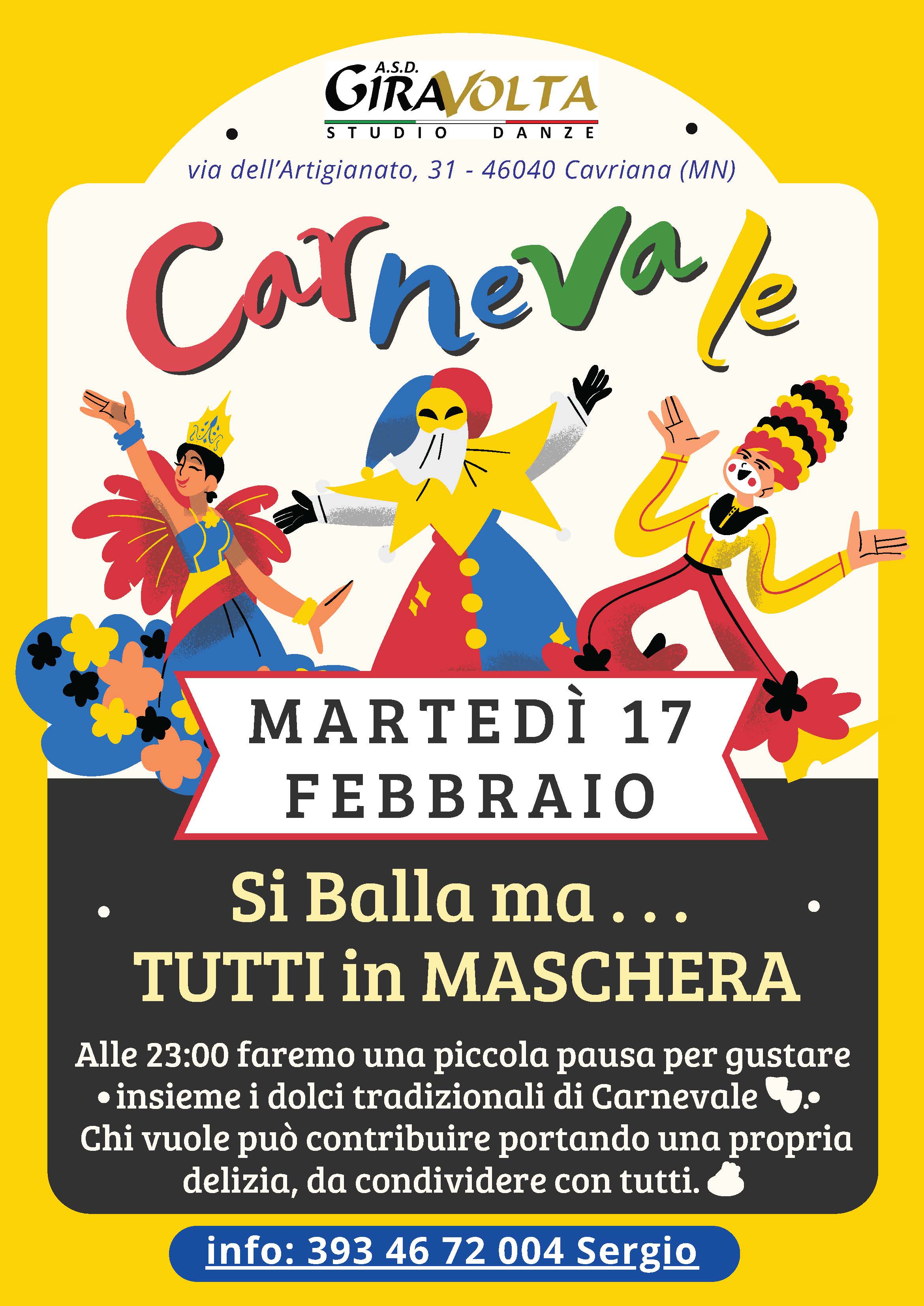 🎭 Martedì 17 febbraio vi aspettiamo alla Scuola Giravolta per una serata di Carnevale dedicata al piacere di ballare e stare insieme, in un clima sereno, allegro e conviviale.